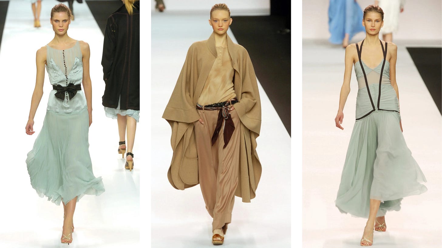 At Chloé, she remade the brand into something romantic but also grounded: breezy babydoll dresses, slouchy low-rise trousers, vintage-inflected prints that felt alive in the early 2000s. She also created what would become one of the decade’s great icons — the Paddington bag, a slouchy padlocked accessory that sent sales soaring and captured the cultural moment. She was named British Designer of the Year in 2004, cementing her as one of the brightest stars in the industry.