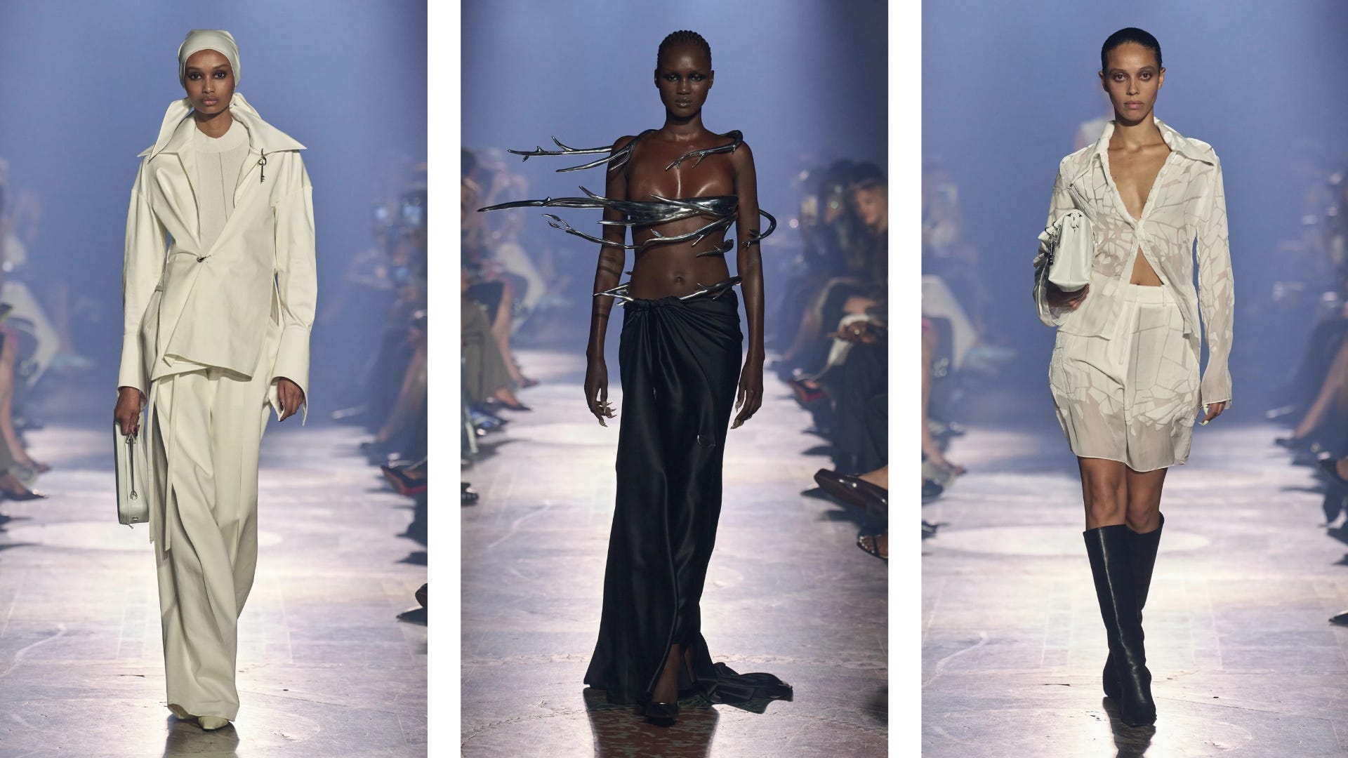 Grace Ling — Body- and gender-inclusive, Ling’s latest collection — Future Relics — explores the tension between the ancient and the futuristic. Her work reminds us that clothing is history in motion: sometimes culture shapes what we wear, other times what we wear shapes culture. Draped fabrics paired with sculptural metallics created a collection that felt like both a time capsule and a portal, collapsing past, present, and future into a single, powerful narrative.