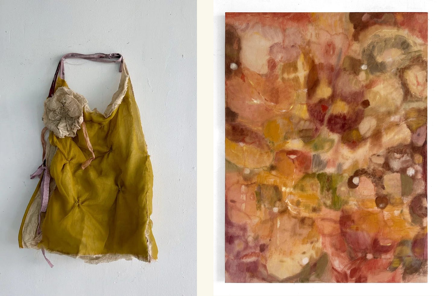 I am torn between where to begin, her art or her clothing. I discovered her artwork first. Rich, layered textures that feel like an inviting dream wrapped in clouds. Her handmade garments echo that same softness, translated into wearable form. Silk and appliqué come together through plant-dyed pigment, resulting in pieces that feel both ethereal and grounded.
